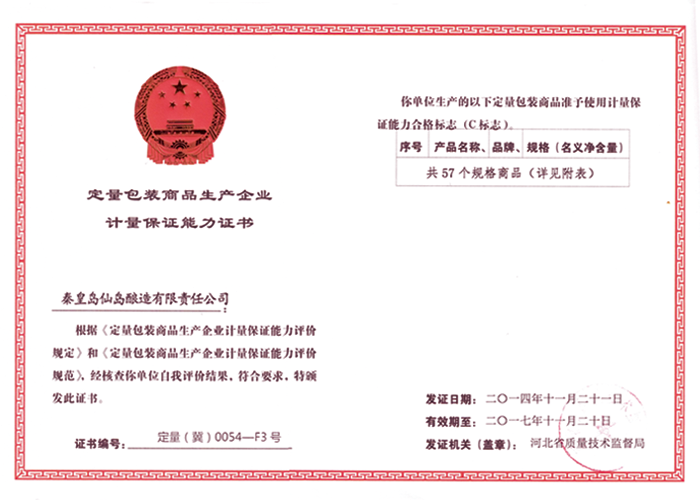定量包裝商品生產企業計量保證能力證書定量包裝商品生產企業計量保證能力證書