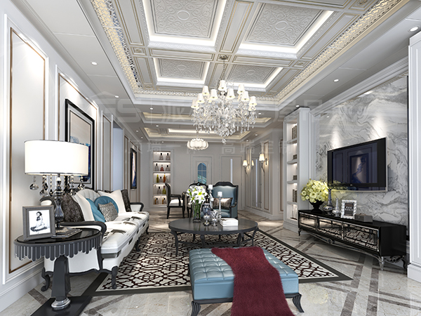 井格式吊頂是通過頂面的造型所制作的假格梁的一種吊頂形式。配合燈具或多種裝飾線條進行裝飾,豐富天花的造型。