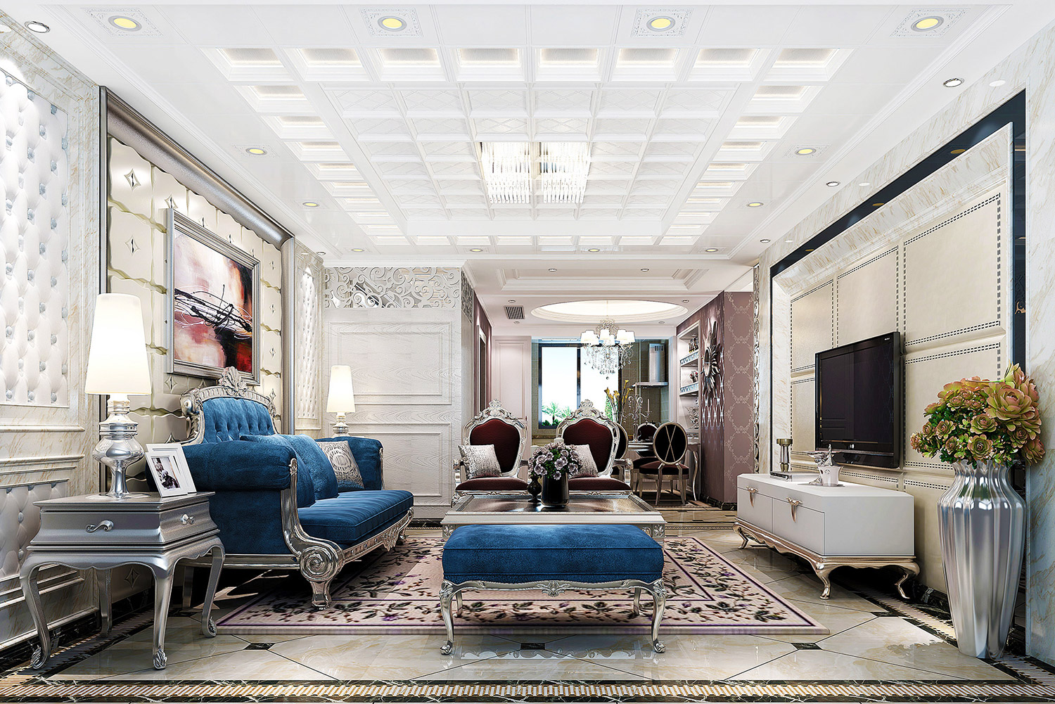 通過格勒吊頂讓空間更有層次感的同時,還讓兩個相對獨立的空間分割出來,進入不同的空間,產(chǎn)生不同的視覺效果。如客廳與餐廳,